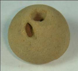 | Description / विवरण | Perforated terracotta bead, betel nut in shape, with hole on the body. |