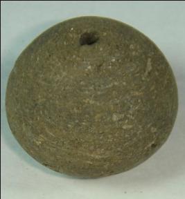 | Description / विवरण | Small terracotta bead with betel nut body and flat base. It has perforated hole in centre and surrounded with striation marks. It is semi fine and has a depression at base. |