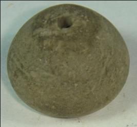 | Description / विवरण | Small terracotta bead with betel nut body and flat base. It has perforated hole in centre and surrounded with striation marks. It is semi fine and has a depression at base. |