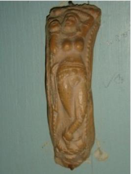 | Description / विवरण | Handle of a jar made of china clay, depicting a Yakshi figure standing on a weight bearer, her left hand is raising upward and with right hand is holding something, which is not clear. The figure of the weight bearer is seen upto chest. |