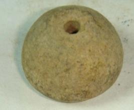 | Description / विवरण | Perforated terracotta bead, betel nut in shape, surface is rough, clay incrustation all over. |
