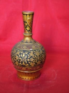 | Description / विवरण | Surahi shaped pot with highly decorated surface in golden and black depicted intricate floral patterns. |