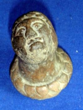 | Description / विवरण | Terracotta block, top having human face with prominent eyes, nose and lips, hair are drawn with incised line. Block has cylindrical body and round base tapering toward top and has floral designs in the corner. Base is broader than top. It has embossed flower at its centre surrounded by two circles. Out of it, one circle is rubbed off. |