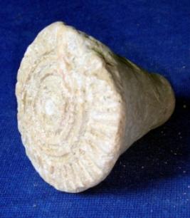 | Description / विवरण | Terracotta seal, betel nut shape, ill fired, broken top and flat circular base. Base have flower designs of incised lines followed by circular lines. Some designs are rubbed off. |
