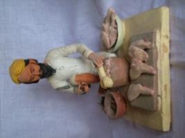 | Description / विवरण | This terracotta model depicts a butcher sitting and cutting a piece of meat kept on a raised platform with the help of a knife. He is wearing a yellow turban and white tunic and lion cloth. Some pieces of meat are kept in front and left side in plates. On the right hand side there is a scale, some weights are kept and also a pot with some coiled items. |