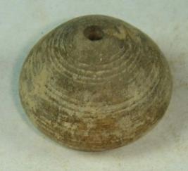 | Description / विवरण | Perforated terracotta bead, betel nut in shape, having deep depression at the base and striation lines all over the body. |