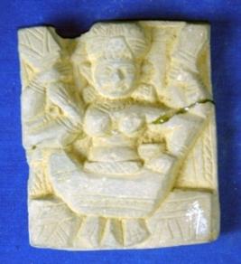 | Description / विवरण | Stone image of four handed Matrika, in low relief in seated position. Attributes from right below- 1 missing 2 holding a club or lotus 3 holding a flower probably 4 rests on thigh. She is adorned with elaborate headgear, bangles, earrings and lower garment which are depicted with incised lines and block designs. Even lips, eyes and toes are depicted with incised lines. |