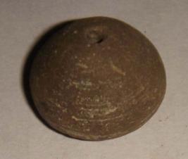 | Description / विवरण | Perforated terracotta bead, betel nut shape, surface is rough, slight depression at the base. |