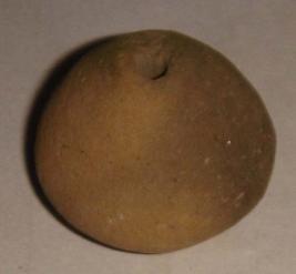 | Description / विवरण | Perforated terracotta bead, betel nut shape, ill fired, surface is rough, slight depression at the centre. |