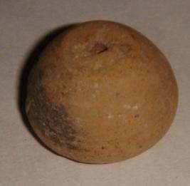 | Description / विवरण | Perforated terracotta bead, betel nut in shape base is chipped off, tip is slightly flat, ill fired. |