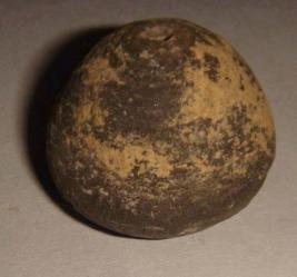 | Description / विवरण | Perforated terracotta bead, betel nut shape surface is rough and chipping off. Clay incrustation all over. |