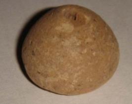 | Description / विवरण | Perforated terracotta bead, betel nut in shape surface is rough and chipped off, slight depression at base, clay incrustation all over. |
