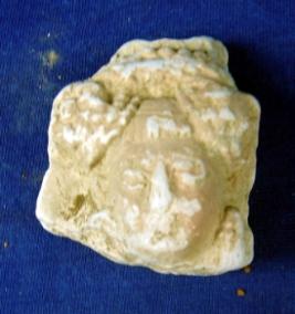 | Description / विवरण | Human head probably male head of lime stone in high relief, adorned with an elaborate headgear at the top and right side of which, pearl strings are seen with a flower depicted with incised lines. The face is almost mutilated. Rest part of the body is missing. |