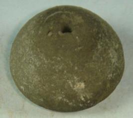| Description / विवरण | Plain, perforated terracotta bead, betel nut in shape having small circular depression at the base. |