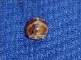 | Description / विवरण | Stone bead, round in shape, orange in colour with white lines, and a perforated hole in the centre. |