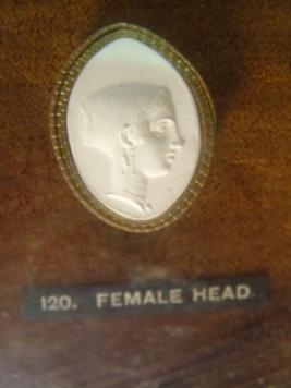 | Description / विवरण | A Greek Gem. It shows a female head in profile. Hair tied up. Fine features. It is an eye shaped cast. Fine relief work in POP, small cast from British Museum. |