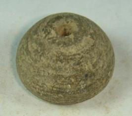 | Description / विवरण | Terracotta bead having a perforated hole, pot shaped body, with incised line near the base and rough surface. |
