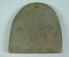 | Description / विवरण | Flat stone pendant, arch shaped, one side is smooth and plain, the other side shows flaking. There is a perforated hole at the top. |
