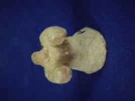 | Description / विवरण | Small human shaped terracotta dice, with hands raised in the front. The head is pinched, has a cylindrical body and circular base. |