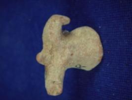 | Description / विवरण | Small, human shaped terracotta dice, with the right hand raised up and the left, raised and bending down. The head is pinched and the body is cylindrical with circular base. The right hand is partly broken. |