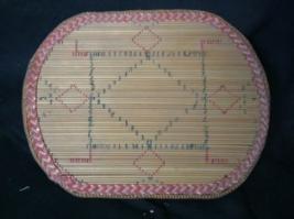 | Description / विवरण | It is a rectangular mat, made of spokes of grass, decorated with thread work and red colour. Its edge is designed with geometrical pattern. |