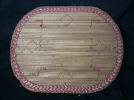 | Description / विवरण | It is a rectangular mat, made of spokes of grass, decorated with thread work and red colour. Its edge is designed with geometrical pattern. |
