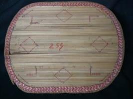 | Description / विवरण | It is a rectangular mat, made of spokes of grass, decorated with thread work and red colour. Its edge is designed with geometrical pattern. |