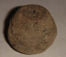 | Description / विवरण | Simple, perforate terracotta bead of pot shape. The tip is slightly flat and the base has depression in the middle. The surface is peeling off. |