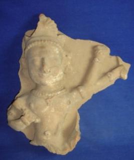 | Description / विवरण | Independent terracotta figurine of four handed Durga. Attributes from right below- 1 a club 2 missing 3 missing 4 a sword. The lower part of the body below waist is missing. She is wearing an elaborated crown, which is partially broken. She is adorned with nose ring, earrings, armlets, bangles and necklace. Her naval is depicted with an incised hole. The figure is in high relief. |