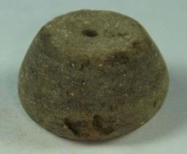 | Description / विवरण | Simple, perforated terracotta bead, betel nut in shape with flat top. |