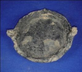 | Description / विवरण | Iron artefact, flat circular and shallow, plate, with a thick rim, with two small knobs for the purpose of handle. It was probably used as utensil. |