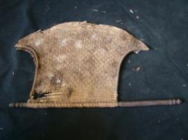 | Description / विवरण | It is a hand fan with a carved wooden handle and two axe shaped wings. It is made of strips of palm leaves with geometrical designs. |