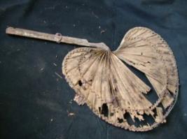 | Description / विवरण | It is an oval hand fan along with a handle made of palm leaf. It is decorated with violet colour and geometrical lines. |