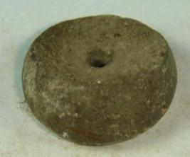 | Description / विवरण | Perforated terracotta bead with a depression at the base and around the perforation. The upper part of the bead is missing, only base is intact. |