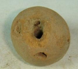 | Description / विवरण | Plain, spherical, perforated terracotta bead, with some incised pits on the surface. |