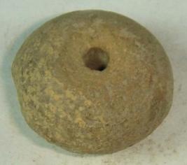 | Description / विवरण | Perforated terracotta bead upper part of the which is convex and mutilated. The base is slightly convex in shape with a depression at the centre around the perforation. |