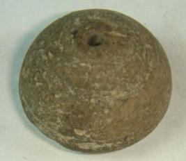 | Description / विवरण | Well made, perforated terracotta bead, betel nut in shape with a small depression around the perforation. Close concentric circles are prominent on the base. It is partially flaked off at the base. |
