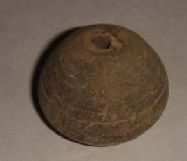 | Description / विवरण | Perforated terracotta bead, biconvex in shape, the tip at one side is flat with a circular depression. Close concentric circles are present around the body. |