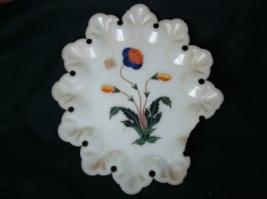 | Description / विवरण | It is an oval marble plate with plaited borders and inlaid with precious stones. The flower in the centre is very well executed. |