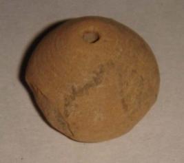 | Description / विवरण | Well made, perforated terracotta bead, betel nut in shape with a slight depression at the base. Its body is slightly flaked off. Very light concentric circles are visible around the body. |