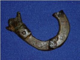 | Description / विवरण | Fragment of an iron hook of U shape. One end has a trident shaped design, below it, a nail is passing across it. The other end is broken. The middle part is flat and plain. |