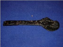 | Description / विवरण | Iron object in shape of pan, a circular plated is attached to a long red. It is probably a toy for children. |
