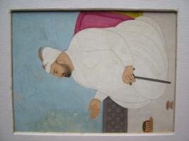 | Description / विवरण | A man is seated on his knees nearby a chair, wearing a white cloth, white turban on head. |