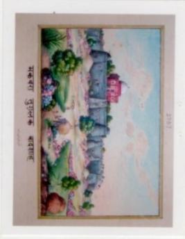 | Description / विवरण | The painting depicts the tomb of Ibrahim Aadil Shah. The tomb has two domes in white colour and eleven minarets; four in red & the rest is in white colour. The ground floor of the tomb is arch shaped. There are some trees in green colour inside the tomb. There is sky in blue & light yellow colour, behind the tomb the foreground has a green field & some portion of moat is also there. Some men are standing, while others are sitting beside the camel. |