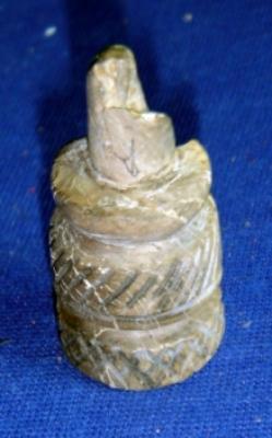 | Description / विवरण | Fragment of decorative bone object with rings like projection, one above another, lowest projection has cross design, middle has horizontal lines, while upper most is plain, at the top there is a pointed knob. |