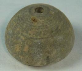 | Description / विवरण | Well made, perforated terracotta bead, betel nut in shape with a slight depression at the base. Close concentric circles are present around the base. |
