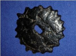 | Description / विवरण | Iron wheel, black in colour. There is an oblong hole in the centre. The circular edge has conical pointed edges. |
