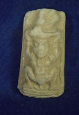 | Description / विवरण | Fragment of a handle of a jar on which a seated Yaksha figure is depicted on low relief. His hands are uplifted and lifting the weight of a female figure probably as crossed feet of the figure is visible on the top. The figure is mutilated and facial features are not clear. Floral designs are visible on the border of the handle. |