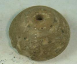 | Description / विवरण | Semi fired, perforated terracotta betel nut shaped bead with a circular shape depression on the centre of the base. Striation marks are seen on the body. |