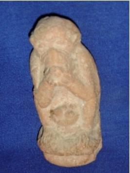 | Description / विवरण | Terracotta animal figurine of a monkey, he is sitting on a pedestal and is having something, probably a plate of fruit in front of him. |